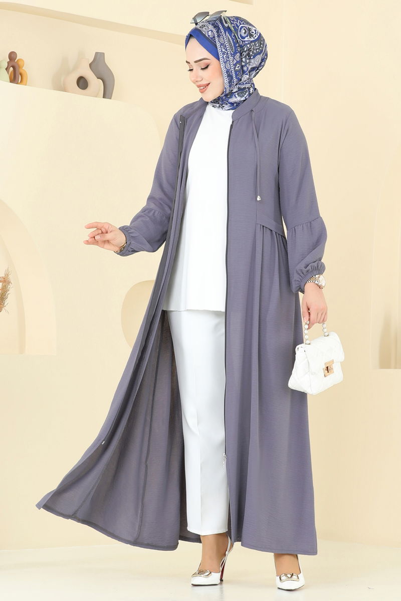 The Front-Zippered Abaya, offers a modern and practical usage. Made from soft Aerobin fabric, this abaya can be comfortably worn in all seasons and cleaned at 30 degrees with delicate wash. Its semi Mandarin collar and elastic-cuffed design merges elegance with comfort. The zipper makes it easy to wear and remove. Additionally, the drawstring details provide an eye-catching aesthetic. This model is an elegant alternative in modest fashion.