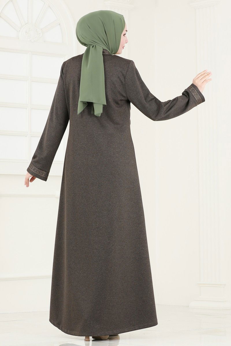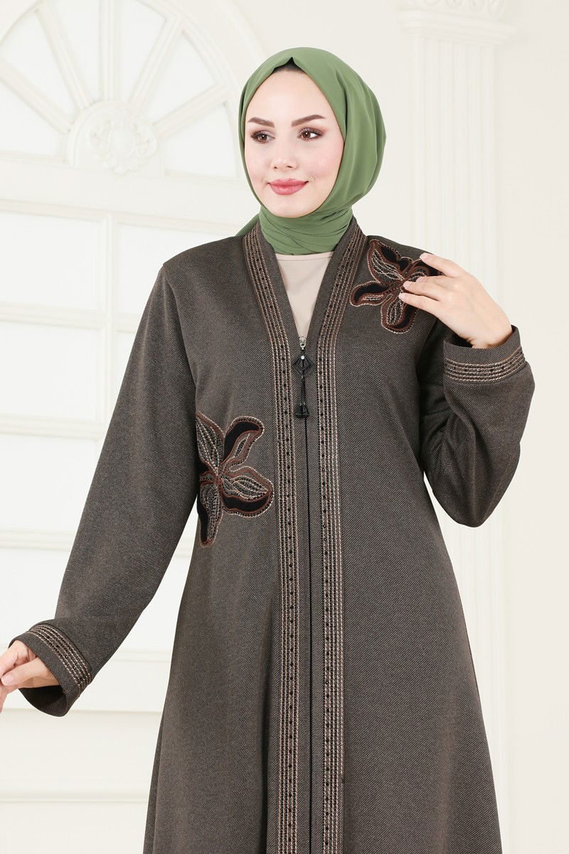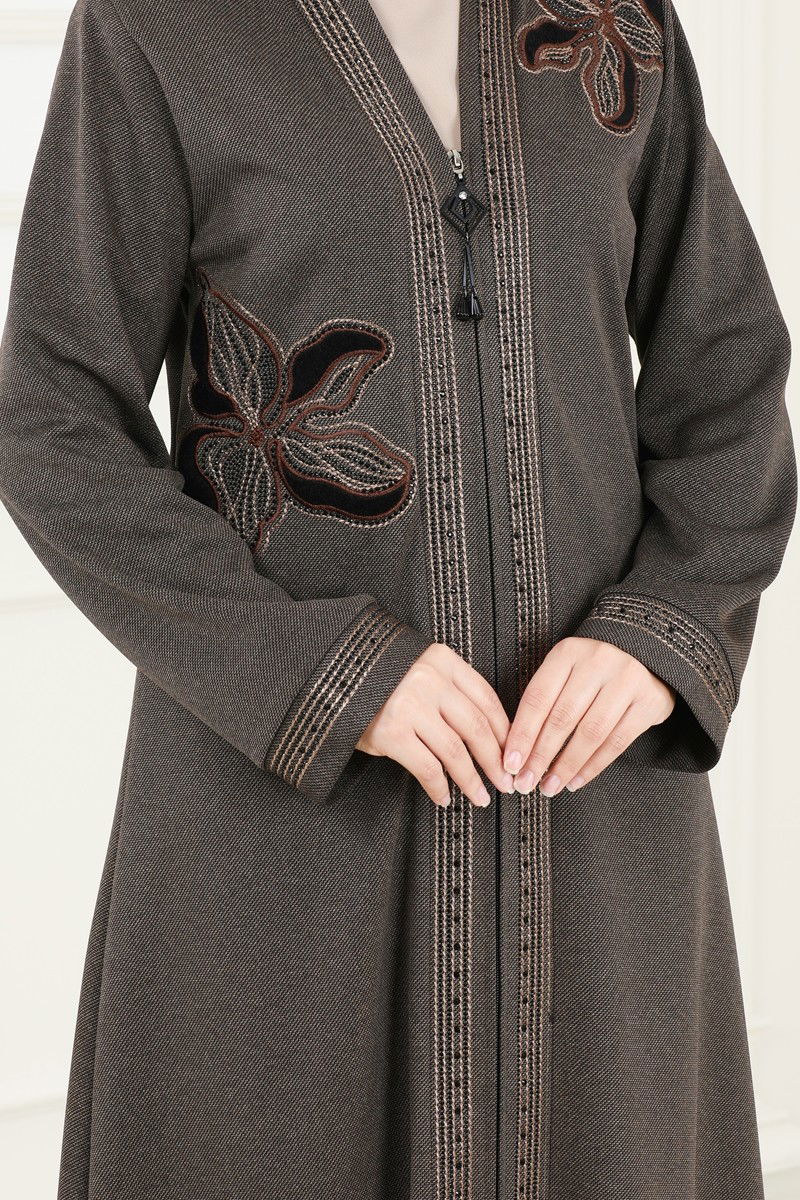 Detailed Processing Overcoat is a modest fashion item designed to be used in autumn and winter seasons. It requires dry cleaning only and is made from atlas fabric. The product has a V-neck collar and is unlined with a front zipper. (The product on the model is size 38.) Height: 160 cm, Chest: 86 cm, Waist: 68 cm, Hip: 95 cm, Weight: 55 kg. The embroidery details are sewn and the stones are not glued. Additionally, it has shoulder pads.