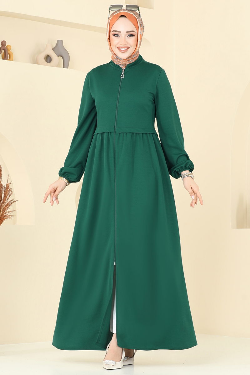 The Front Zippered Ferace is a modest wear made from delicate crepe fabric. It features a semi-mandarin collar and a front zipper for ease of use. Its elastic cuffs provide comfort in movement, while its lining-free design ensures it can be worn comfortably across all seasons. The product is suitable for a gentle wash at 30 degrees Celsius. The piece displayed on the model is size 38, offering effortless elegance.