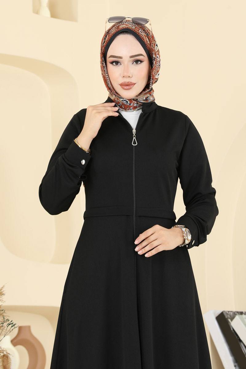 The Zip-Front Detailed Ferace is a stylish and functional garment designed specifically for those who prefer modest clothing, suitable for all-season wear. It can be washed gently at 30 degrees without spinning. Made from Knit Crepe fabric, this ferace offers a modern look with its mandarin collar design and provides light and comfortable wear with its unlined structure. The zip detail at the front allows for practical use, while the stitched waist detail creates an elegant silhouette. The ferace increases its functionality with pockets on the sides and active buttons on the cuffs. The product featured is in size 38.