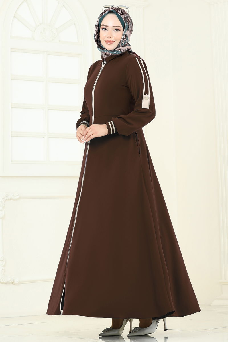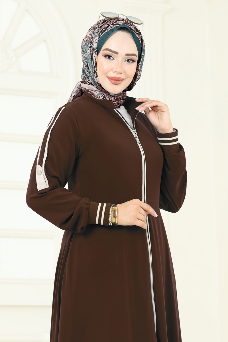 The Piped Detail Ferace is a stylish and practical garment designed specifically for women who prefer modest attire. Suitable for all seasons, this ferace can be washed at a gentle 30 degrees Celsius. Made from Medina silk fabric, this model offers a lightweight and comfortable experience without lining. The front zip design of the product adds a versatile elegance. It perfectly displays an ideal look with a standard size 38 on the model.