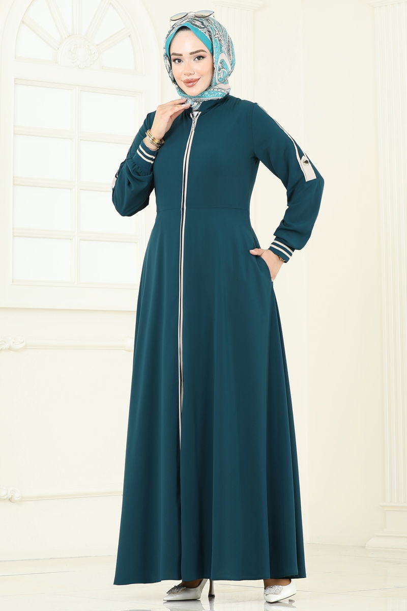 The Piped Detail Ferace is a stylish and practical garment designed specifically for women who prefer modest attire. Suitable for all seasons, this ferace can be washed at a gentle 30 degrees Celsius. Made from Medina silk fabric, this model offers a lightweight and comfortable experience without lining. The front zip design of the product adds a versatile elegance. It perfectly displays an ideal look with a standard size 38 on the model.