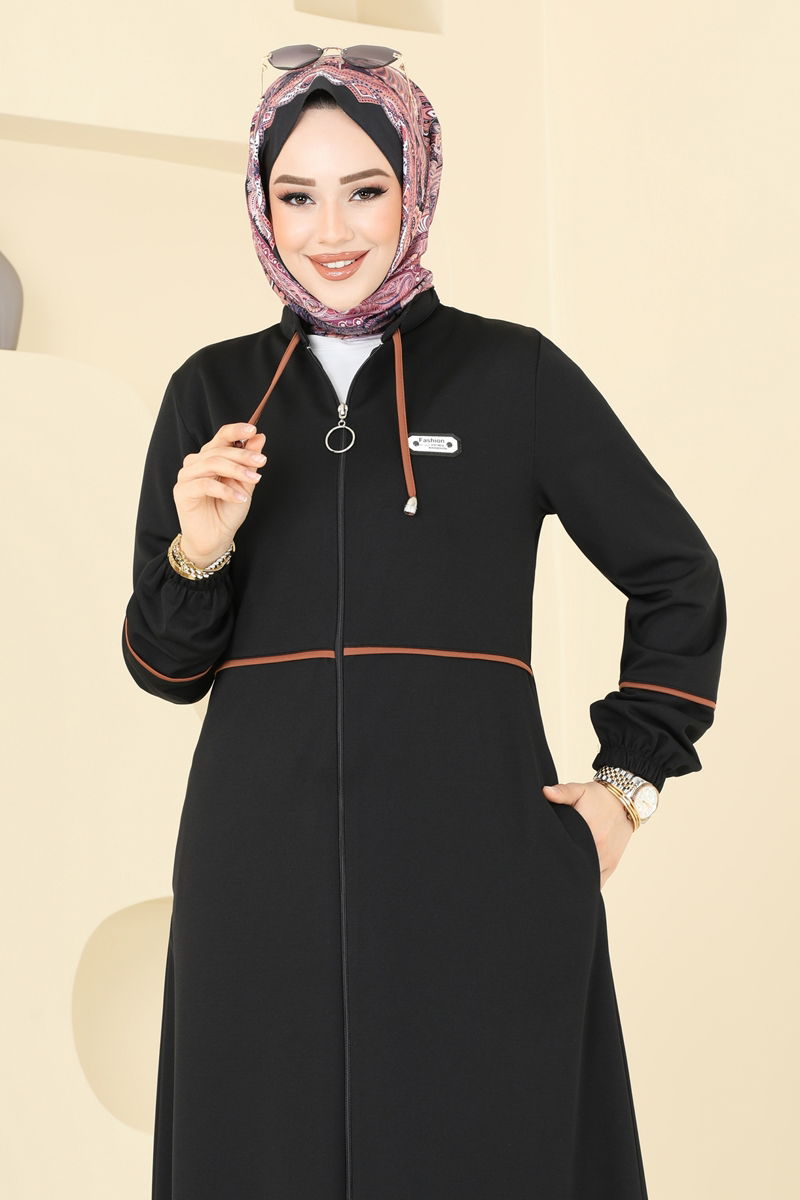 Elegantly designed with badge details and a front zipper, this chic abaya is suitable for all seasons. Made from special knitted dabıl fabric, it is both comfortable and durable. Easily maintainable with its 30-degree washable feature, it enhances comfort with a semi-mandarin collar and elastic cuffs while side pockets provide practical use. Embellished with lace-up and badge details, this ferace blends classic and modern elements to maintain your elegance in any setting.