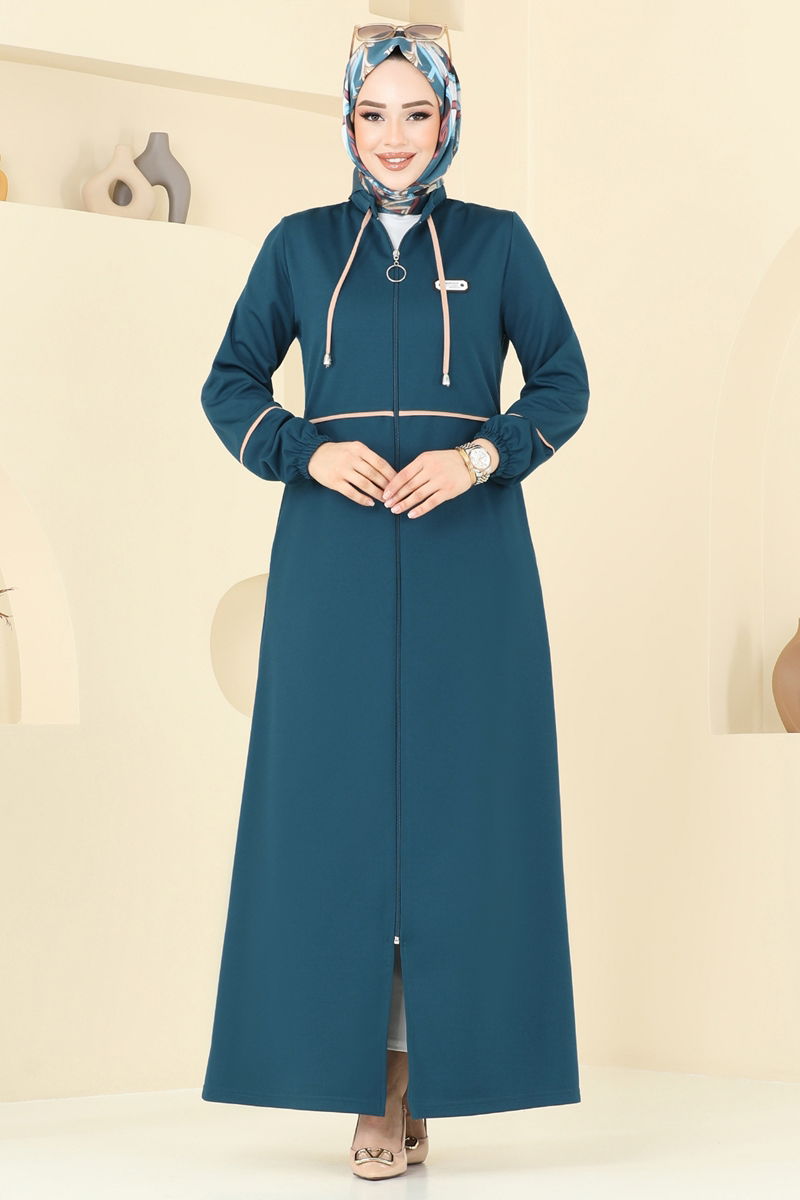 Elegantly designed with badge details and a front zipper, this chic abaya is suitable for all seasons. Made from special knitted dabıl fabric, it is both comfortable and durable. Easily maintainable with its 30-degree washable feature, it enhances comfort with a semi-mandarin collar and elastic cuffs while side pockets provide practical use. Embellished with lace-up and badge details, this ferace blends classic and modern elements to maintain your elegance in any setting.