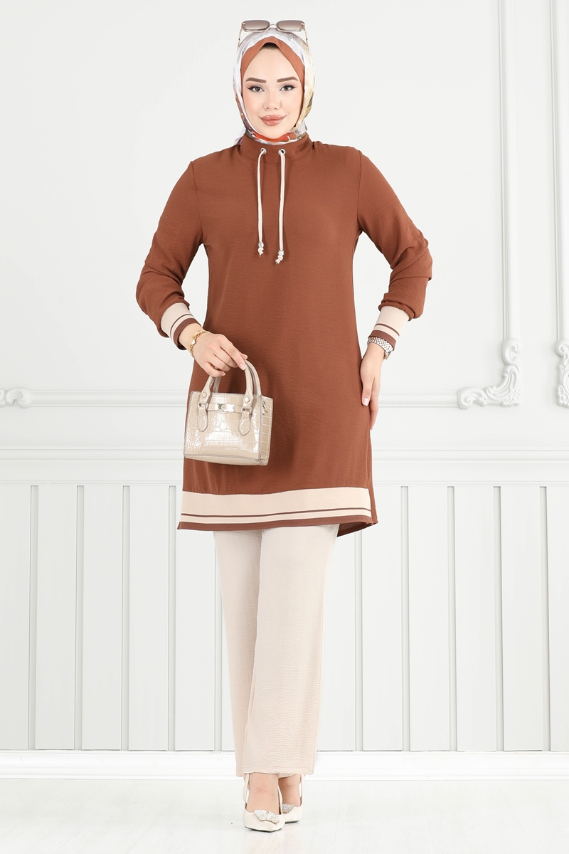 Ürün Detayı : Son moda tesettür giyim ürünüdür. Arkasında kullanışlı bir düğme mevcuttur. Ürün hakim yaka tasarımına sahiptir. Tunik yanlarda yırtmaç detaylarına sahiptir. Astarı yoktur. Dekoratif bağcıklar eklenmiştir.Fotoğraf çekimleri nedeniyle renkte hafif farklılıklar oluşabilir.