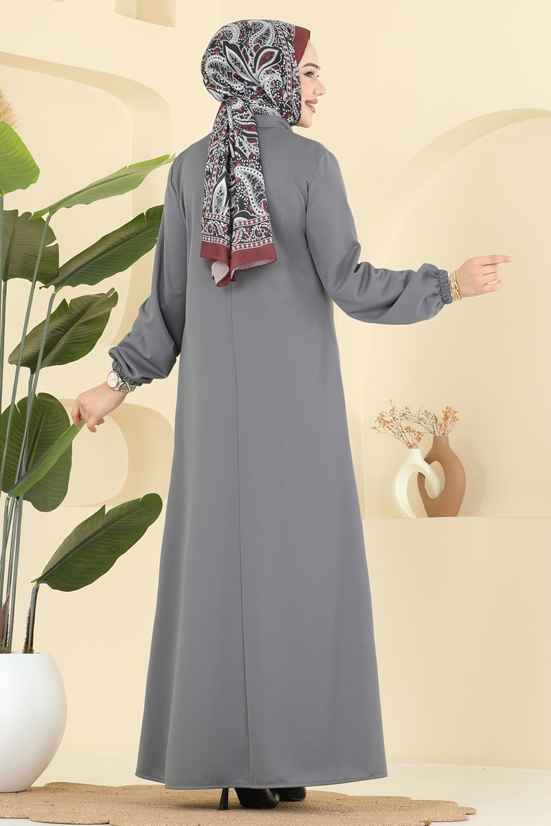Elegan ve işlevsel Antrasit Renkli Aksesuarlı Düz Ferace, tüm yıl boyunca hem konfor hem de şıklık sunar. 30 derecede hassas yıkama yapılabilen bu zarif tasarım, örme Dabıl kumaştan üretimiyle dikkat çeker. Yarım Hakim yaka ve astarsız yapısı ile hafif ve konforlu bir kullanım sağlar. Fermuarlı ön kısmıyla pratik bir kullanım sunar ve dekoratif bağcıklar ile şık bir görünüm sunar. Manşet lastik detayı kol hareketlerinizde rahatlık sağlar.