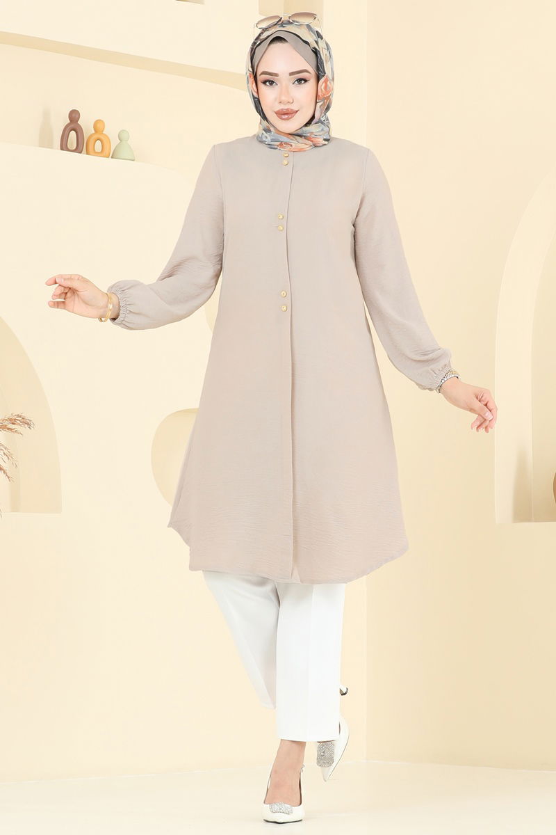 Tesettür Tunik - Taş Rengi Düğmeli Detay