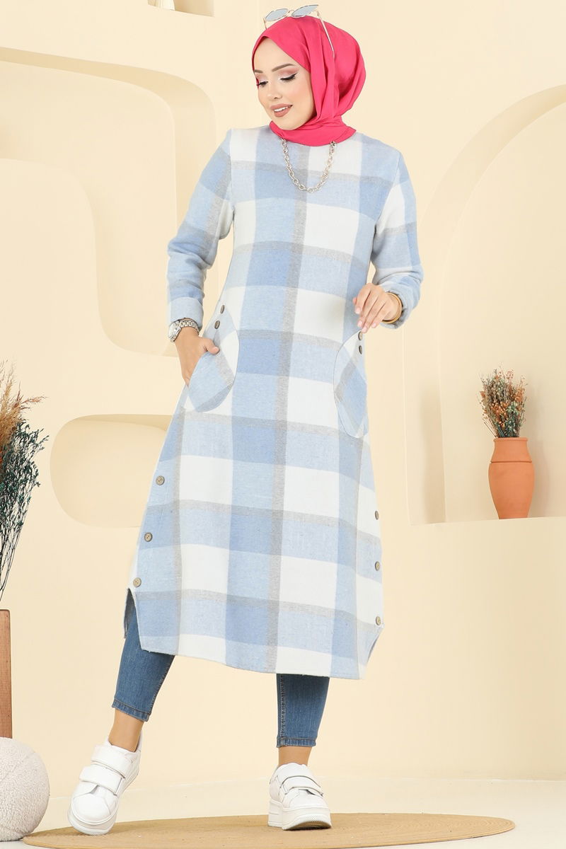 Aksesuar ve Düğme Detaylı Ekose Tunik - Bebe Mavi
