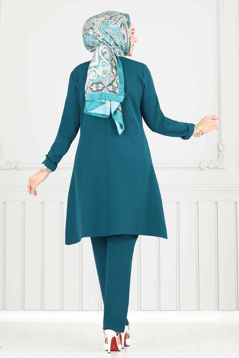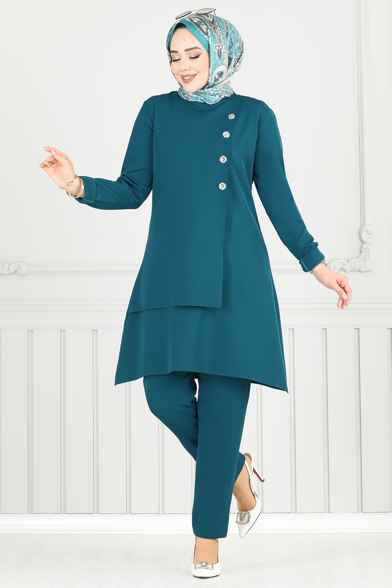 Aksesuar Düğmeli Tesettür Takım 23012UKB139-MS Petrol