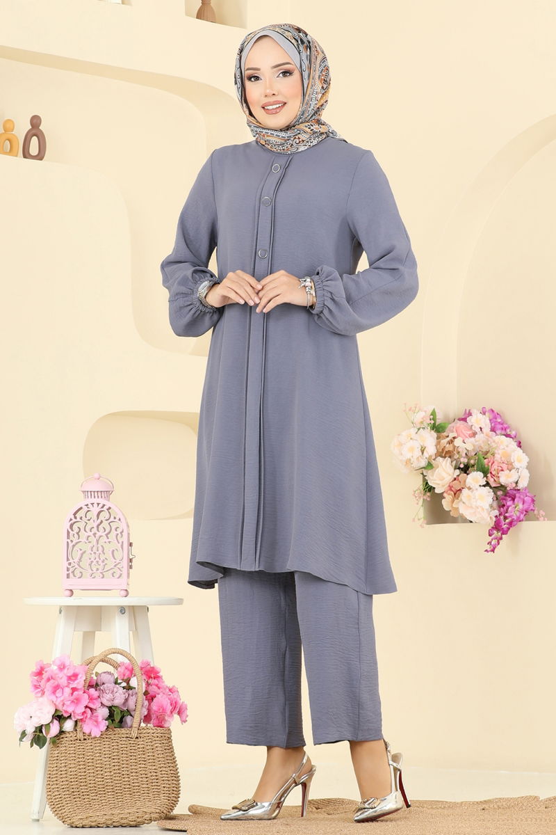 Antrasit renkli Aksesuar Düğmeli Aerobin Kıyafet Takımı, yılın her mevsimi keyifle tercih edebileceğiniz bir tesettür stilidir. 30 derece hassas yıkama programında yıkanabilir. Nefes alabilen aerobin kumaş yapıya sahiptir ve tam gün konfor sağlar. Trend bisiklet yaka tasarımı ve astarsız oluşu ile modern bir şıklık sunar. Elastik manşetler ve elastik pantolon beli ile mükemmel oturuş sağlamaktadır. Dekoratif eklenmiş düğmeler ise şıklığı arttıran detaylardır.