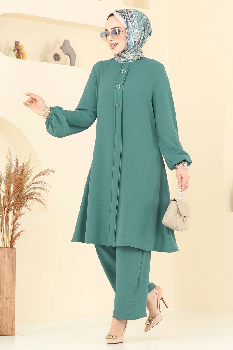 Ürün Detayları: Yeni sezon tesettür giyim ürünüdür. Ürün bisiklet yaka kesimindedir ve astarsızdır. Düğmeler dekoratif olarak kullanılmıştır. Pantolon beli ve paçaları lastiklidir. Çekimlerden dolayı renk farklılıkları olabilir.