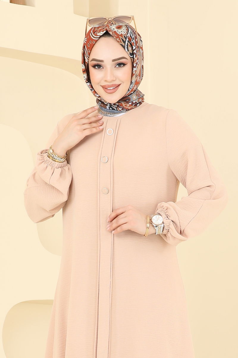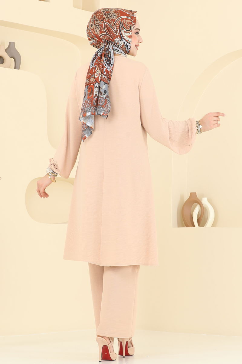 Ürün Tanımı : Yeni sezon tesettür modasına uygun bir üründür. Üründe kullanılan Bisiklet yaka, astarsız yapıdadır. Dekoratif amaçlı düğmeler bulunmakta, pantolonun bel kısmı elastik ve paçaları lastiklidir. Fotoğraf çekimi sebebiyle renk tonlarında farklılık olabilir.