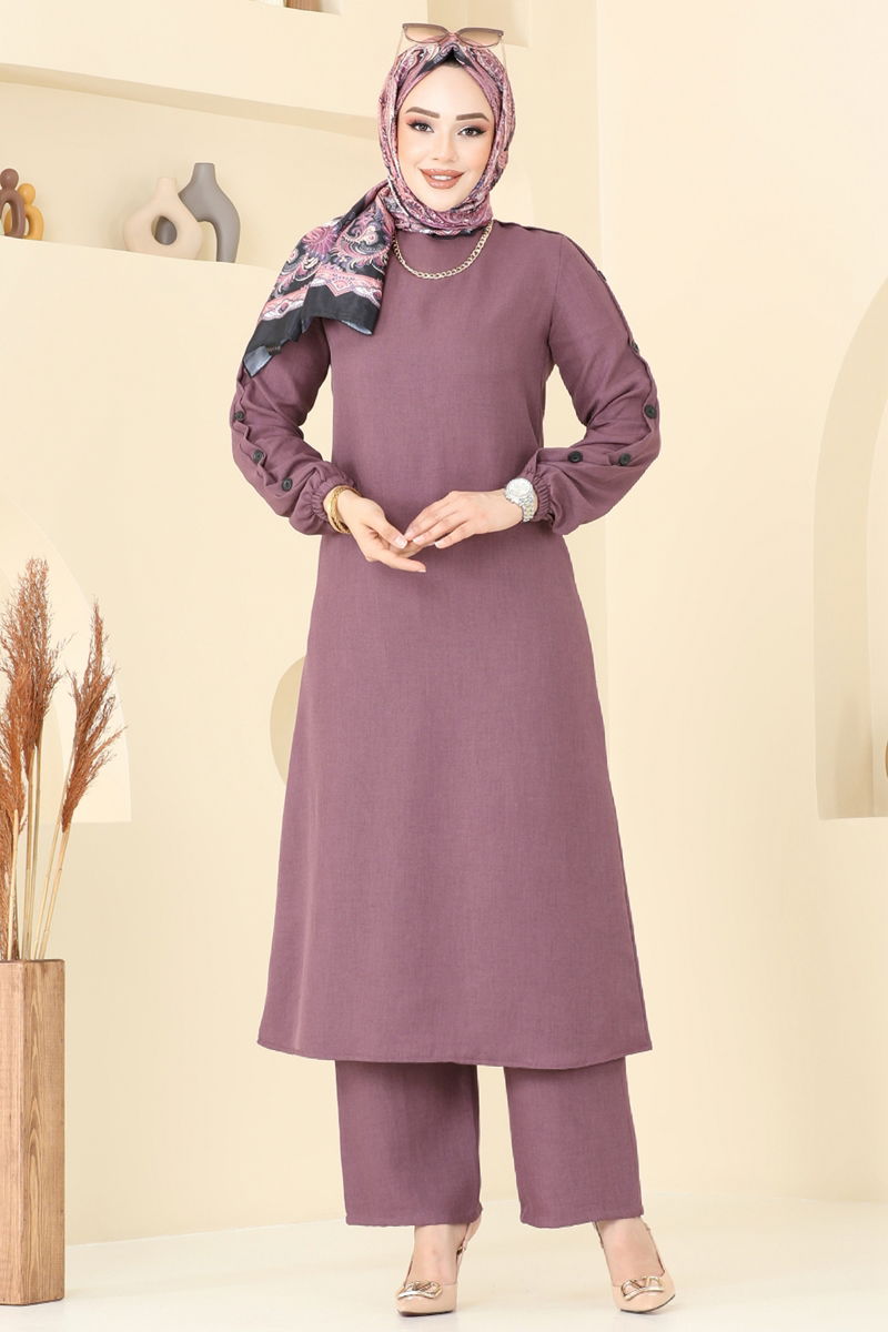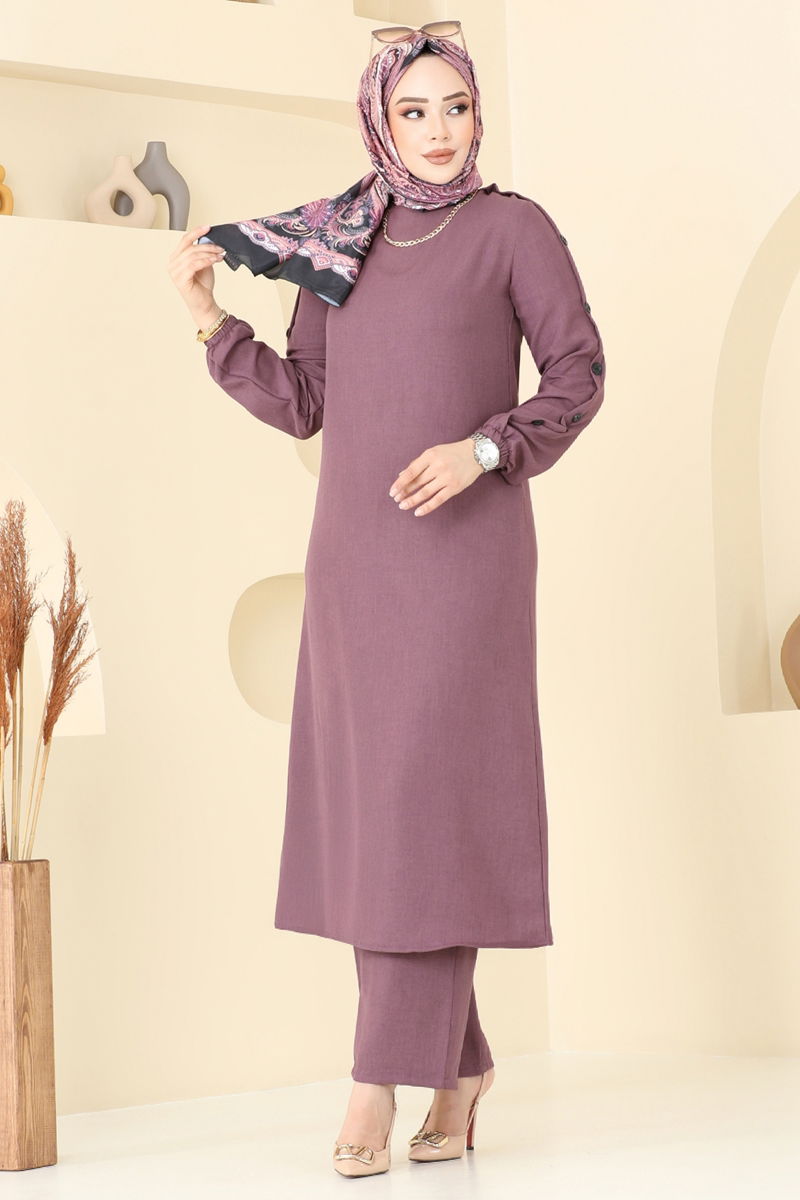 Ürün Karakteristiği : Tesettür modasına uygun yeni sezon tasarımıdır. Ürün bisiklet yaka tasarımlıdır. Astarı bulunmamaktadır. Sırttan fermuarlıdır ve düğmeler dekoratif bir özellik katmaktadır. Pantolonun bel kısmı elastiktir. Konsept çekimlerine göre renk tonlarında değişiklik olabilir.