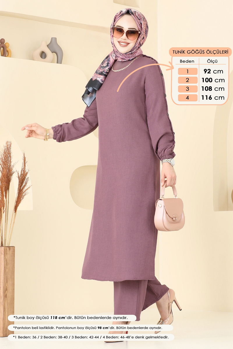 Detaylı Apoletli Keten Takım, modern ve zarif bir tesettür giyim parçası olarak dört mevsim boyunca tercih edilebilir. Yapısı itibarıyla rahatlık sunan Sofia keten kumaş kullanılan bu ürün, 30 derecede hassas yıkama ile temizlenebilmektedir. Fermuarlı kolay kullanım sunan, astarsız yapısı ve bisiklet yakası ile şıklığı destekleyen detaylara sahiptir. Manşetleri elastik olan tunik ve pantolon tasarımı ile konforlu bir kullanım sağlar. Modelin temel ölçüleri şunlardır: boy 165 cm, göğüs 88 cm, bel 68 cm, basen 99 cm ve ağırlık 56 kg.