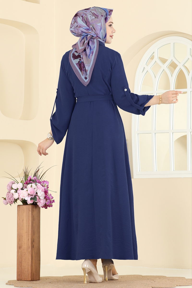 Elbise Detayları : Modaya uygun tesettür giyim tasarımıdır. Gömlek yaka tarzındadır. Ön kısmı yarım düğmeli ve kullanışlıdır. Astarı yoktur ve şeffaf olmayan yapıdadır. Elbisenin bel kısmı dikişlidir ve kemer geçirme yerleri yoktur. Kemer, elbise ile birlikte verilmekte, kullanımı kişisel tercihe bağlıdır. Kol ağızlarında kullanılabilen apolet düğmeler yer almaktadır.Renk tonu çekim koşullarına göre farklılık gösterebilir.
