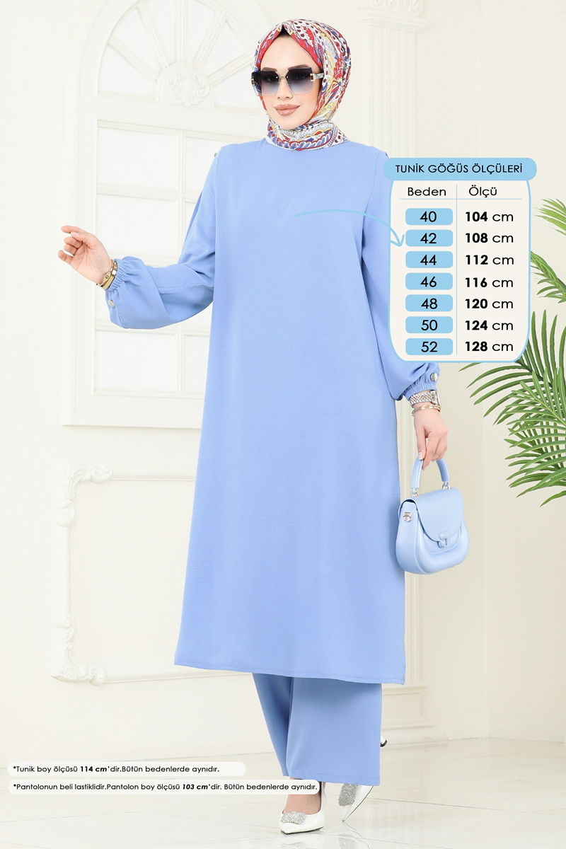 Bu açık mavi tesettür takım, dört mevsim giyilebilir yapıda olup, aerobin kumaşı sayesinde yüksek konfor sunar. Hassas yıkama ile temizlenebilen bu takım, modern bisiklet yaka tasarımı ve astarsız yapısı ile dikkat çeker. Sırt bölgesinde yer alan düğme detayı kullanım kolaylığı sağlar. Pantolonun esnek beli ve lastikli paçaları rahat bir kullanım sunarken, tasarımın şık ve zarif duruşu her ortamda göz alıcı bir stil oluşturmanıza olanak tanır.