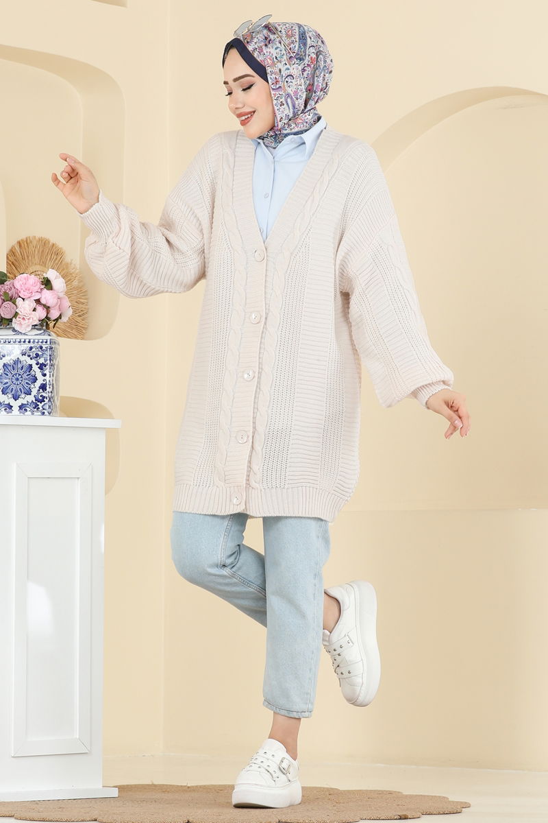 Bu açık bej triko hırka, soğuk aylarda sıcaklığınızı koruyacak bir tesettür giyim seçeneğidir. Hassas 30 derece yıkama önerisi ile bakımı kolaydır. V yakası ve düğmeli ön tasarımıyla kullanışlıdır. Astarsız oluşu, rahat bir kullanım sağlar. 36 ile 42 beden aralığındaki standarda uygun tasarlanmıştır.