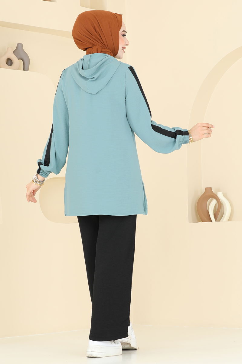 Mint ve Siyah renk seçenekleriyle birlikte, bu takım her sezon rahatlıkla kullanılabilir. 30 derecede hassas yıkama yapılabilmektedir. Aerobin kumaşından tasarlanmış bu set, kapşonlu ve yanları yırtmaçlı bir tunikle birlikte gelmektedir. Ürün astarsız olup, üzerindeki arma detaylarıyla fark yaratır. Lastikli beli ve bilekleri sayesinde rahat bir kullanım sunan pantolon, giyildiği anda konfor sağlar.