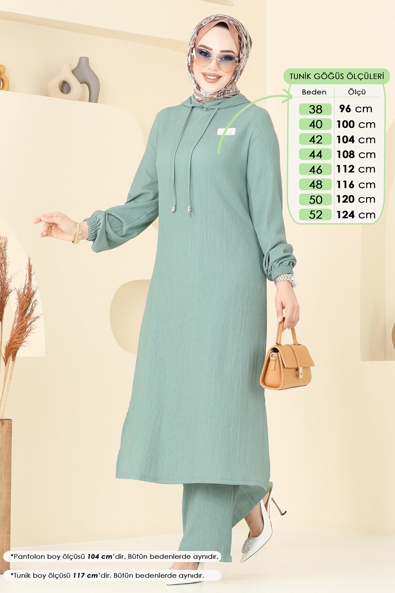 Mint renkli bürümcük takım, her sezon konforla kullanabileceğiniz özel bir tesettür giysisidir. Yumuşak dokusu ile rahatlığı garanti eder ve nazik yıkama koşullarında dahi kolayca temizlenir. Kapşonlu ve yırmaçlı tunik, modern bir görünüm sunarken, astarsız yapısıyla hafifliği sağlar. Detayları ile göz dolduran bu takım, elastik beli sayesinde gün boyu konfor sunar.