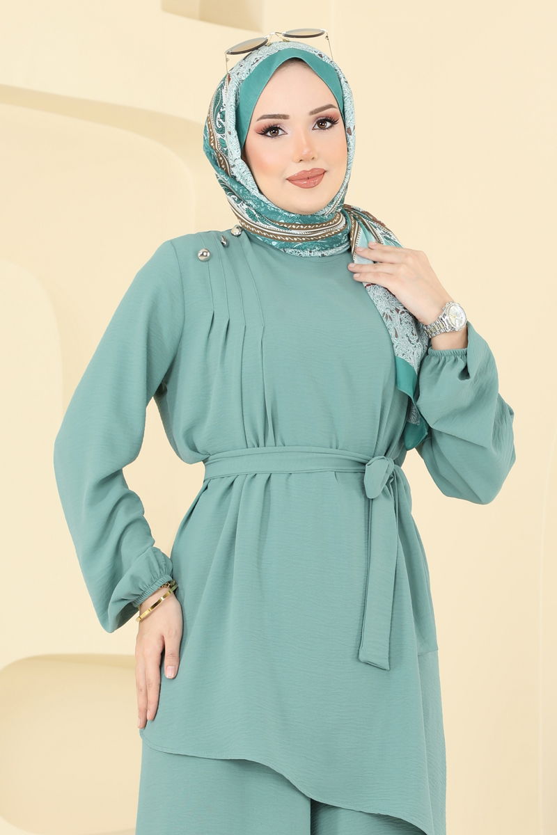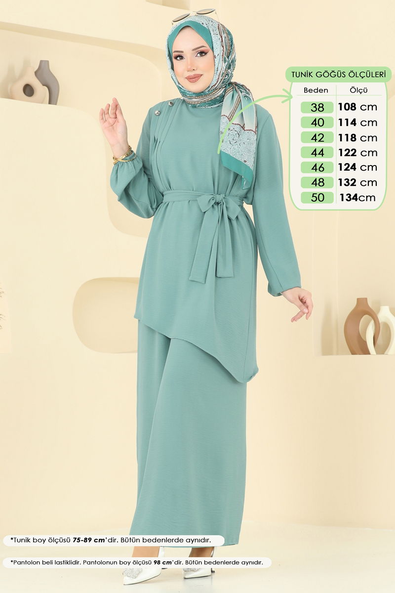Tasarım Detayları : Tesettür modasına uygun yeni sezon tasarımı. Ürünün arkasında düğme detayı mevcut ve yuvarlak yakadır. İç astarsızdır. Modelde gösterilen düğmeler dekoratif olup, kemer ürüne ek olarak sunulmaktadır ve kullanımı isteğe bağlıdır. Pantolonun beli lastiklidir ve manşetleri elastiktir. Renk tonlarında çekim ışıklarına bağlı olarak farklılık olabilir.