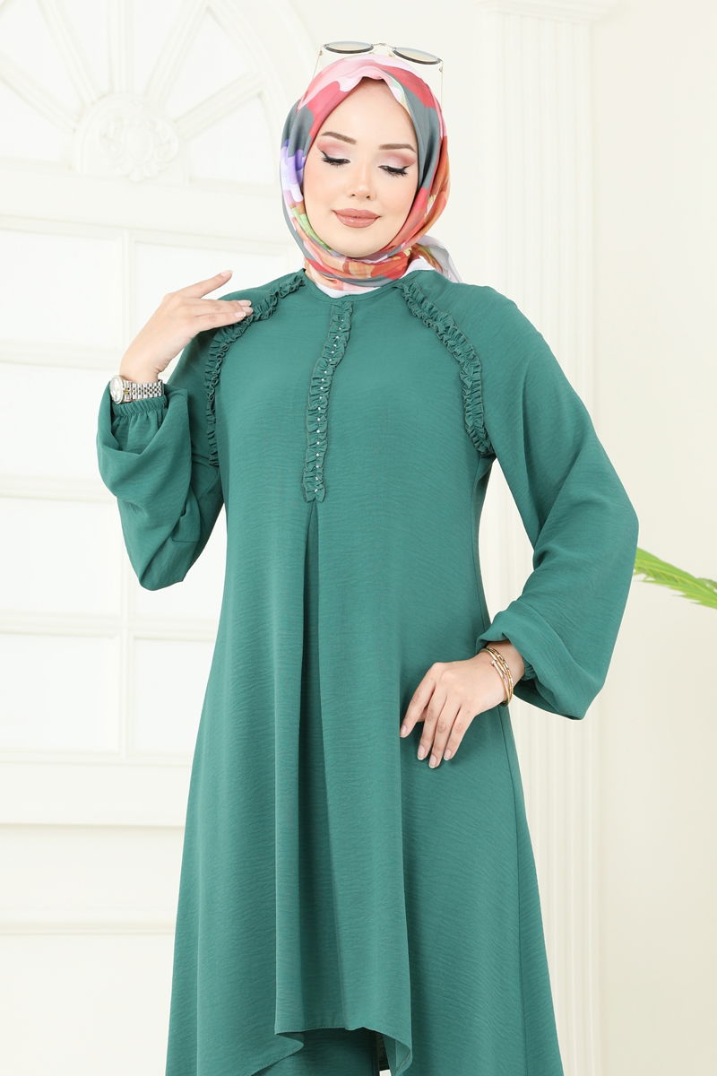 Ürün Detayları: Tesettür giyimde yeni sezon trendlerinden biridir. Üzerinde arka kısmında kullanım kolaylığı sağlayan bir düğme bulunur. Ürün bisiklet yaka tasarımına sahiptir ve astarsızdır. Taş detaylar yapışkanlıdır ve pantolonun beli lastiklidir. Ürün manşetleri esnektir. Işık koşullarına bağlı olarak ufak renk değişiklikleri görülebilir.