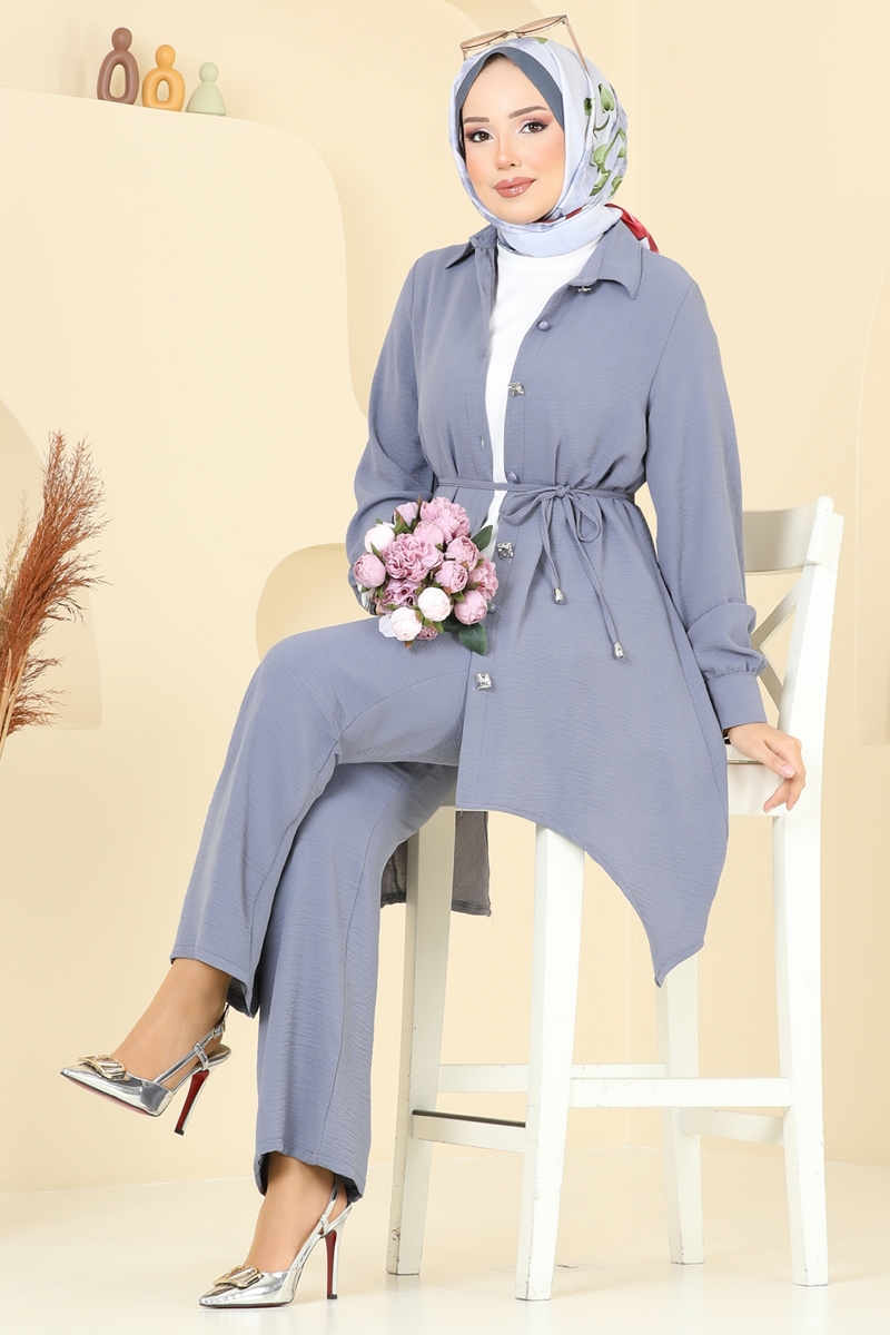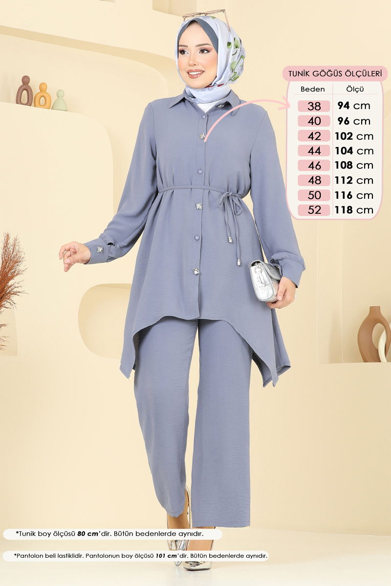 Ürün Detayları: Ürün, mevsimlik tesettür modasına uygun tasarlanmıştır. Gömlek tipi yaka detayına sahiptir. Ön kısmı düğmeli ve astarsızdır. Kemer ürünle birlikte gelmektedir ve isteğe bağlı çıkarılabilir. Tunik ve pantolon kombini için önerilen bluz dahil değildir. Pantolonun bel kısmında esneklik için lastik kullanılmıştır. Elbise manşetleri düğmelidir. Renk tonları çekimler sebebiyle değişiklik gösterebilir.