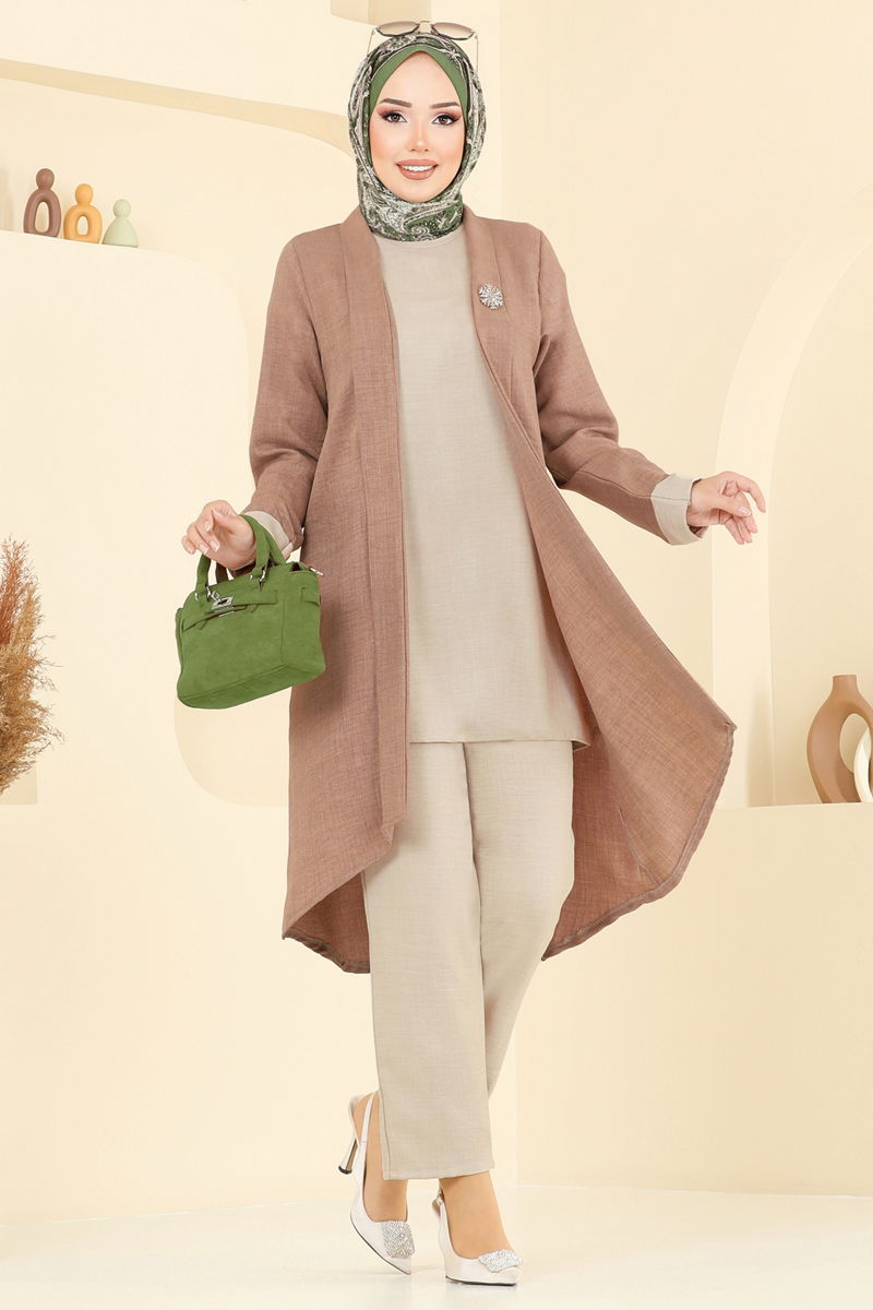 Asimetrik Formlu Üç Parça Kombin, sofia keten kumaşın rahatlığıyla tasarlanmış, dört mevsim tercih edilebilecek zarif bir tesettür setidir. Astarsız bisiklet yaka tasarımı, kolsuz iç tunik ve lastikli pantolon beli ile hem şık hem de konforludur. Arka düğme detayı pratik kullanım sağlar. 30 derecede hassas yıkama ile uzun süre formunu korur. Modern kesimi ve uyumlu parçaları ile gardırobunuza değer katar.