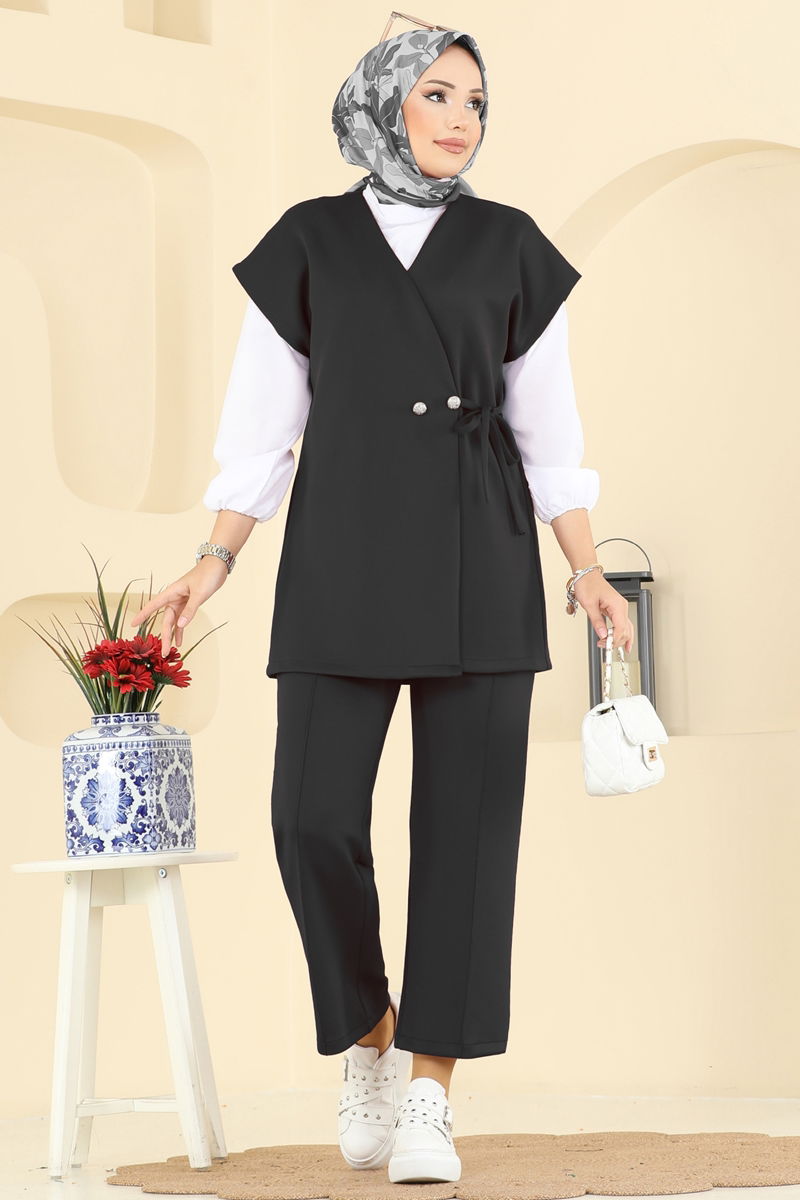 Ürün Detayları:Tesettür modasına uygun tasarım. Kap kollu yapısı ve yelekte iç kısımdaki bağlama detayı dikkat çeker. Üründe V yaka kullanılmıştır. Astarı bulunmamaktadır. Dekoratif düğme detayları mevcuttur. Bluz sete dahil değildir, kombin önerisi olarak sunulmuştur. Pantolonun bel kısmı elastiktir.Renk tonu çekimlerde farklılık gösterebilir.