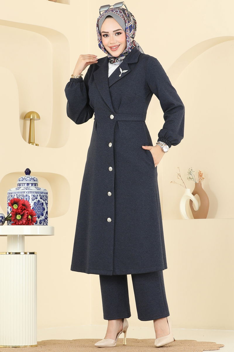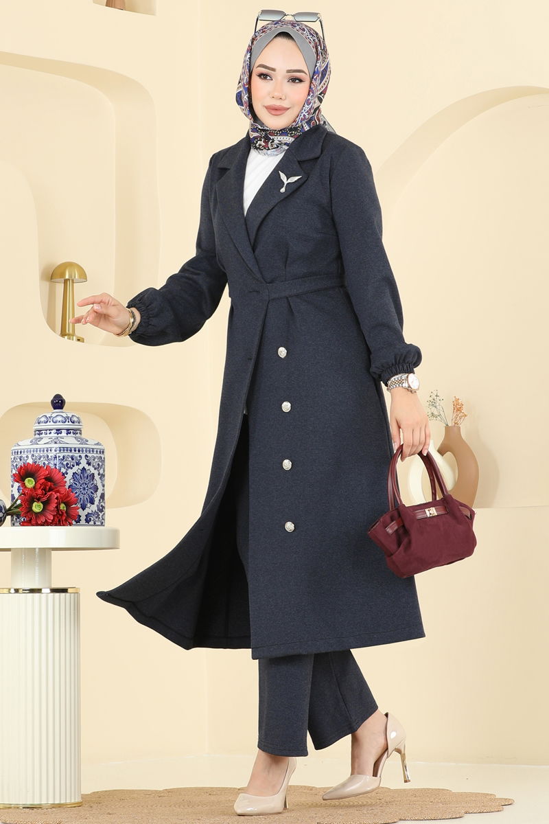 Ürün Detayları: Yeni sezona ait tesettür moda ürünüdür. Ürün içerisinde gizli cepler bulunmaktadır. Ürün cruvaze yakaya sahiptir. Ürün ön kısmından düğmeli kapanışa sahiptir. Astar içermez. Kemer cekete sabitlenmiştir. Pantolonun bel kısmı elastiktir. Pantolon bilekleri lastiklidir.Resmi çekimlerinden dolayı üründe renk değişiklikleri olabilir.