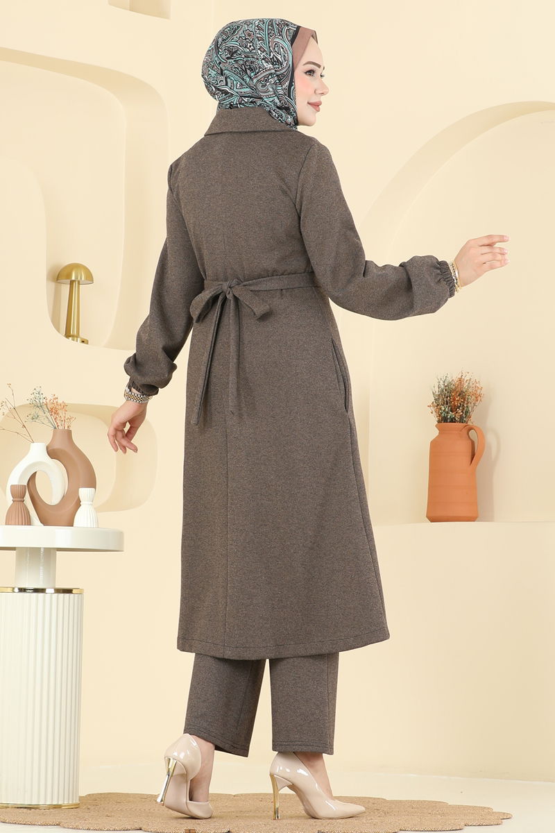 Ürün Detayları : Tesettür moda koleksiyonunun yeni sezon ürünüdür. Gizli cep detayına sahiptir. Ürün Kruvaze kesim yaka tasarımına sahiptir. Önden düğmeli kapama özelliğine sahiptir. Astarsızdır. Kemer ürüne entegre edilmiştir. Pantolonun beli lastiklidir. Pantolonun paçaları lastiklidir.Renk tonu çekim ışıklarından dolayı farklılık gösterebilir.