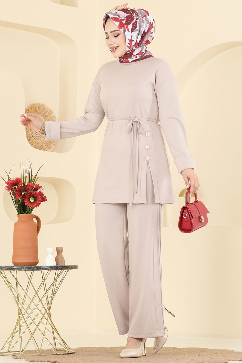 Tasarım Özellikleri: Modern tesettür modasına uygun. Bisiklet yaka tasarımı mevcuttur. Dekoratif yırtmaç düğmeler eklenmiştir. Astar içermez. Bağcık detayları çıkartılabilir ve ayarlanabilir. Pantolonun beli lastikli yapıdadır. Manşetlerde şık düğmeler kullanılmıştır.Renk tonlarında çekim teknikleri nedeniyle farklılık görülebilir.