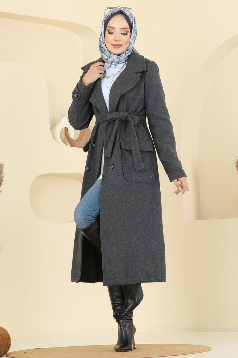 Antrasit Beli Bağcıklı Kaşe Kaban