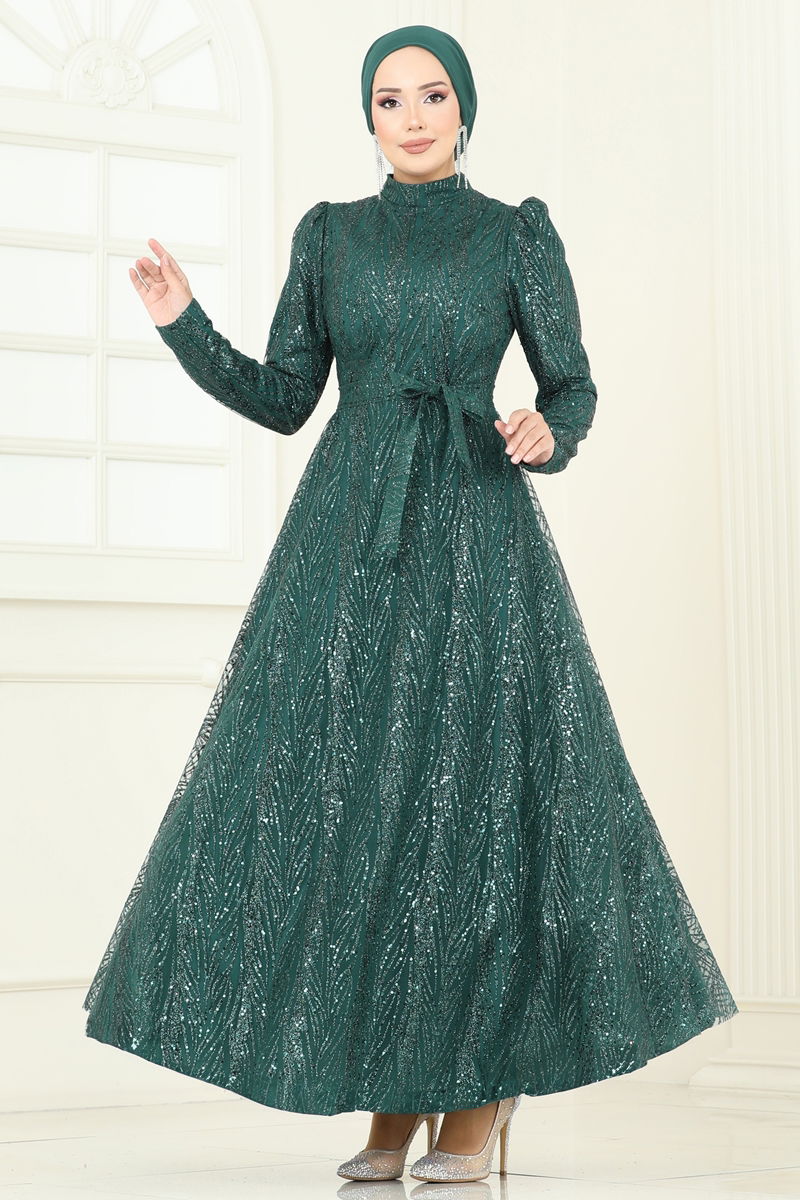 Yeşil Simli Tül Bel Bağlamalı Abiye
