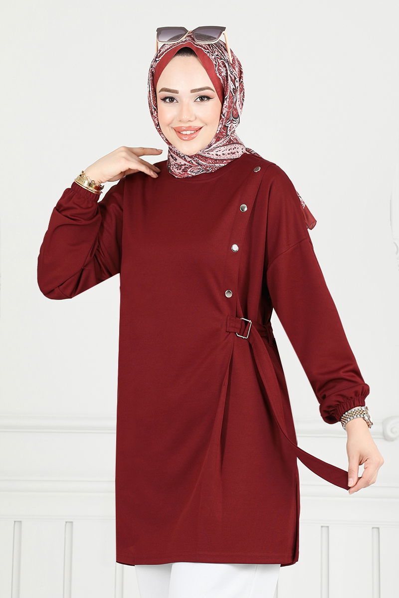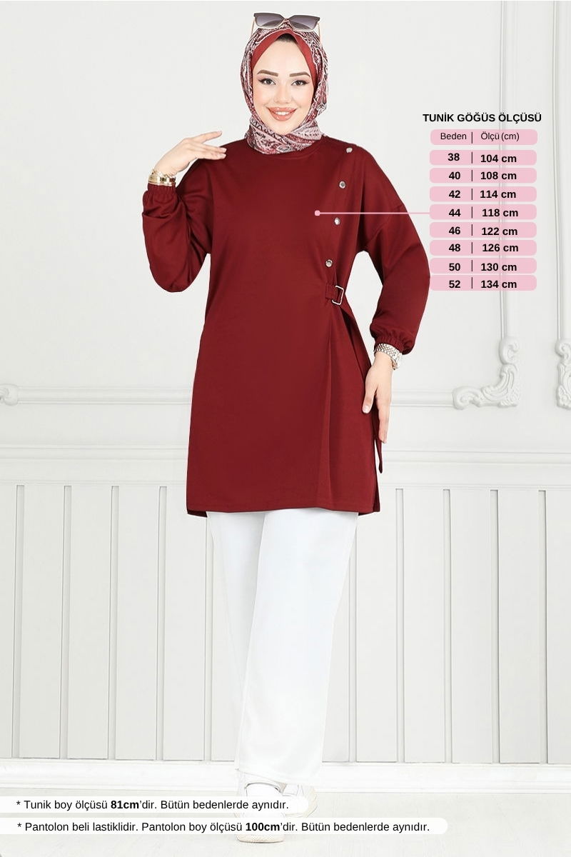 Beli Bağcıklı Tesettür Takım 2708AYD969-M Bordo&Ekru