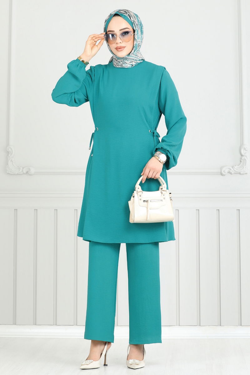 Beli Bağcıklı Tesettür Takım 3004BM387-MS Açık Petrol