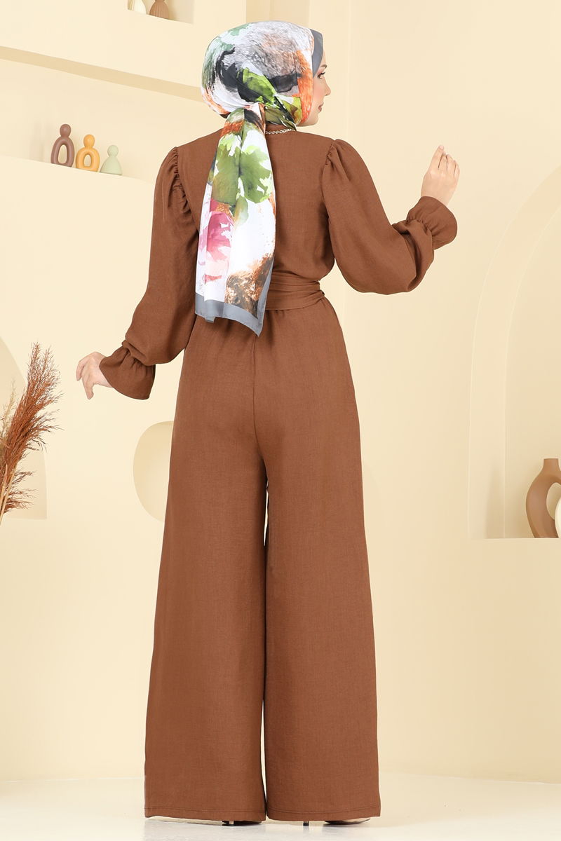 Sofia Keten Tulum, kahverengi rengi ile her mevsim giyim için uygundur. Bu özel keten kumaş yapısı, şık ve rahat bir kullanım sunarken, yazın sıcak günlerinde serinlik sağlar. Hassas yıkama ile bakımı kolaydır. Tulum, bisiklet yaka ve sırttan fermuarlı bir yapıya sahiptir, yan kısmında bağlanan kemer ile farklı vücut tiplerine kolayca uyum sağlar. Elastik manşetleri şıklığı tamamlayıcı bir detaydır ve tulumu gardırop için ideal bir seçim yapar.TULUMUN BEDEN ÖLÇÜLERİ (CM)Beden Göğüs Boy 38 96 144 40 100 144 42 104 144 44 108 144 46 112 144 48 116 144 Ağırlık(Kg):0.52 -