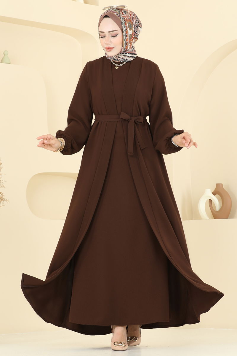 Kahverengi Kuşaklı Tesettür Elbise Seti