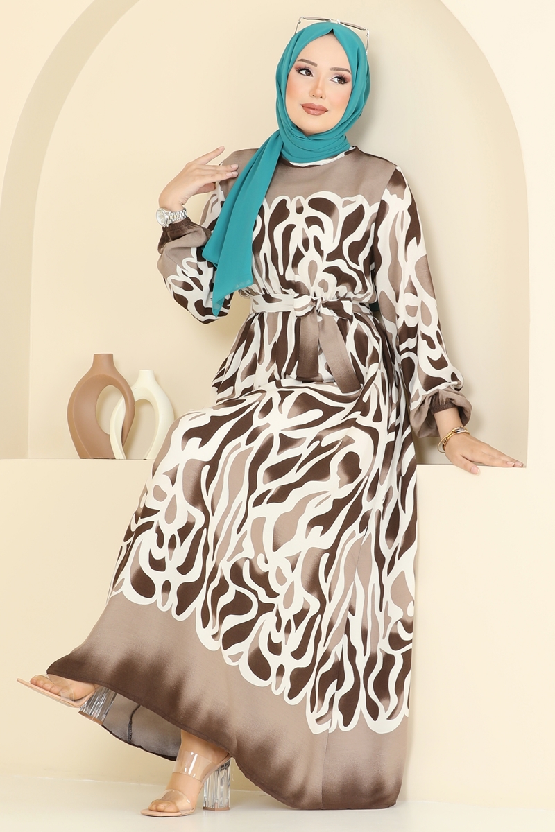 Beli Lastikli Desenli Elbise 7127BG354-MS Kahve