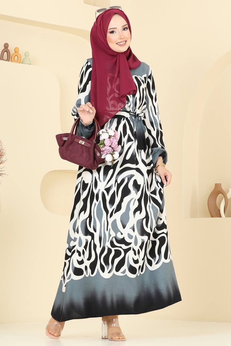 Beli Lastikli Desenli Elbise 7127BG354-MS Siyah