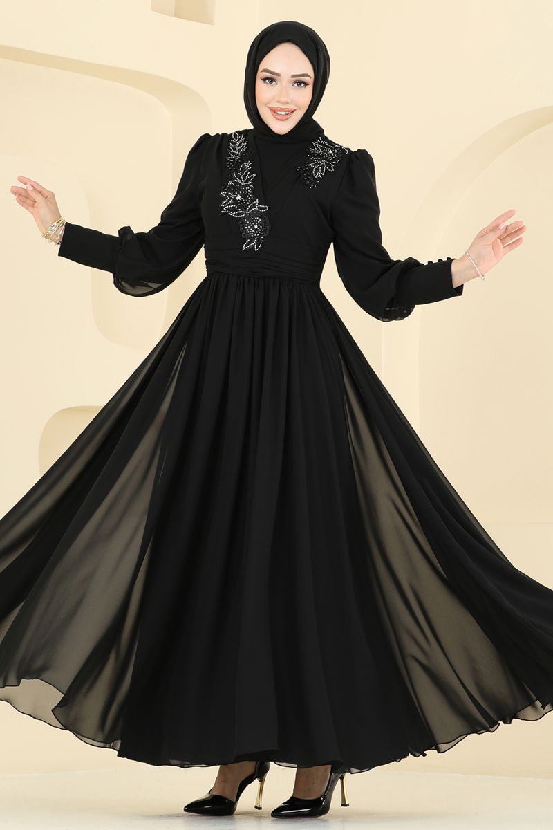 Beli Pilise Detaylı Şifon Abiye 8084AB368-MS Siyah