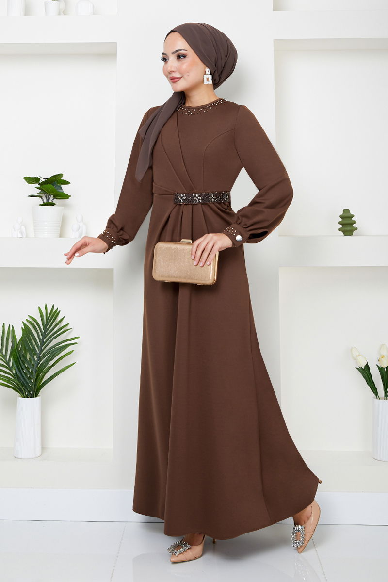 Evening Dress with Stone Embroidered Waist KahveKumas Feature: It is made of first-class Knitted fabric. It can be used in Four Seasonal seasons. Product Feature: New season hijab is a fashion product. The product is a bicycle collar. It is unlined. The product is zipped at the back. Stamps are adhesives. The cuff buttons are active. There may be a tonal difference in the product due to concept photo shoots. Washing : Only dry cleaning should be done. (The product on the model is size 38) Product Length : 141 cmManken Dimensions : Height : 1.67 (Without shoes) Chest: 80Bel : 68Basen :96NOTE: The product mold is a one-to-one mold and it is recommended to order your own size. The exchange time for this product is 24 hours. Since the product is an evening dress product, for exchange, you must send it to us with the cargo you received no later than 24 hours after the product reaches you.Beli Stone Embroidered Evening Dress is a hijab evening dress model that can be used in four seasons. It is recommended to do dry cleaning only. It is made of first-class knitted dab fabric. The product has a bicycle collar cut and is unlined. It is zipped at the back and the product on the model is a size 38. The stamps are adhesive and the cuff buttons are active.Weight (Kg):0.45