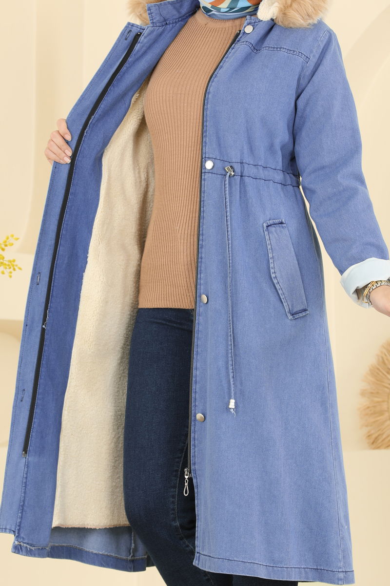 Kürklü Detaylı Kot Kap, hem tesettür hem de modern tarza uygunluğuyla dört mevsim rahatlıkla tercih edilebilir. Kot ve kürk kumaşın birleşimiyle üretilen bu kap, gizli düğmeler ve ayarlanabilir bel tasarımıyla pratik bir kullanım sunar. Detaylarda şık bir duruş sağlayan kürklü iç kaplama ve çıkartılabilir kapüşon bulunmaktadır. Ekstra fermuar ve ceplerle işlevsellik arttırılmıştır. 30 derece hassas yıkama ile temizlenebilir.