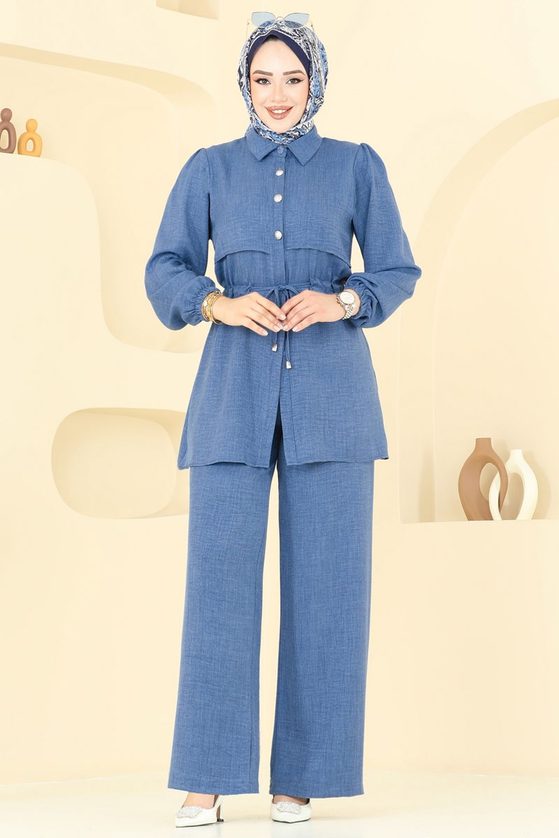İndigo Renk Belli Tünelli Sofia Seti, modern ve zarif bir tesettür kombinidir. Dört mevsim boyunca konforlu bir kullanım sunar ve 30 derece hassas yıkama gerektirir. Keten kumaşla tasarlanmış olan bu ürün, düğmeli ön yapısı ve gömlek yakası ile dikkat çekici bir görünüm sağlar. Tunik ve pantolon oluşan bu set, iş toplantılarından günlük kullanıma kadar her ortamda idealdir. Sete bluz dahil değildir, kombin önerisi olarak sunulmuştur. Pantolonun lastikli beli maksimum rahatlık sunar.