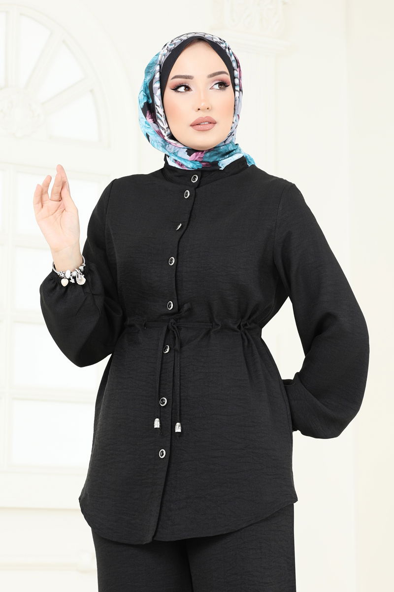 Sofia keten kumaştan üretilen Kordonlu Siyah Takım, her mevsim keyifle kullanılabilecek şık ve konforlu bir tesettür giyim alternatifidir. 30 derece hassas yıkama ile temizlenebilen bu takım, üzeri düğmeli ve yarım mandalina yaka tasarımlı tunik içermektedir. Astarsız yapıda olan bu takım, elastik pantolon beli ve lastikli manşet özellikleriyle gün boyu rahatlık sunmaktadır. Set içerisinde herhangi bir aksesuar bulunmamaktadır ve her dolapta bulunması gereken zevkli bir parçadır.