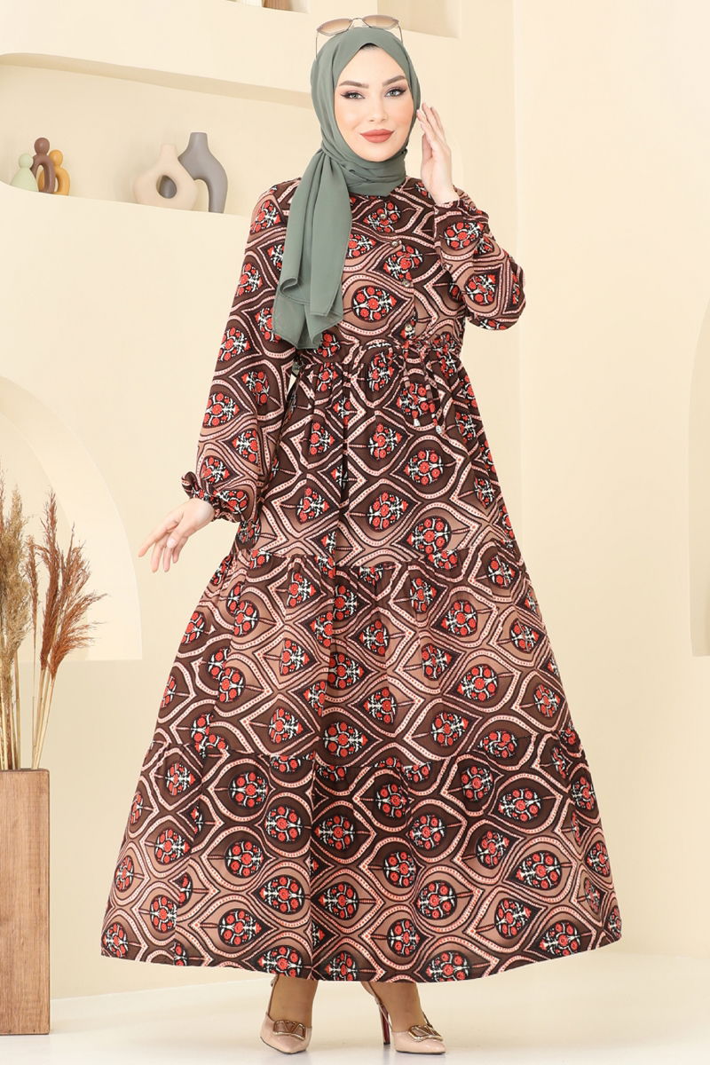Beli Tünelli Tesettür Elbise 1137BG354-MS Kahve