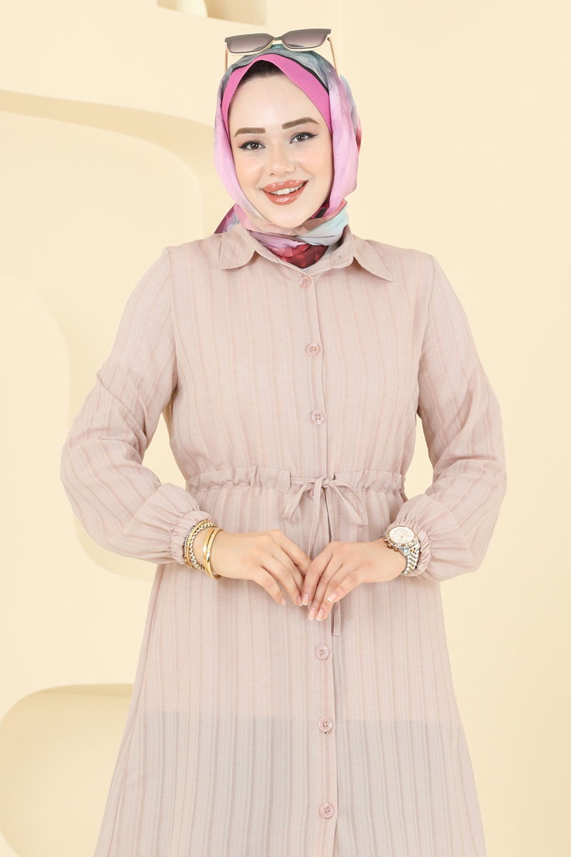 Tesettür Tunik: Beli İp Detaylı Bej Tasarım