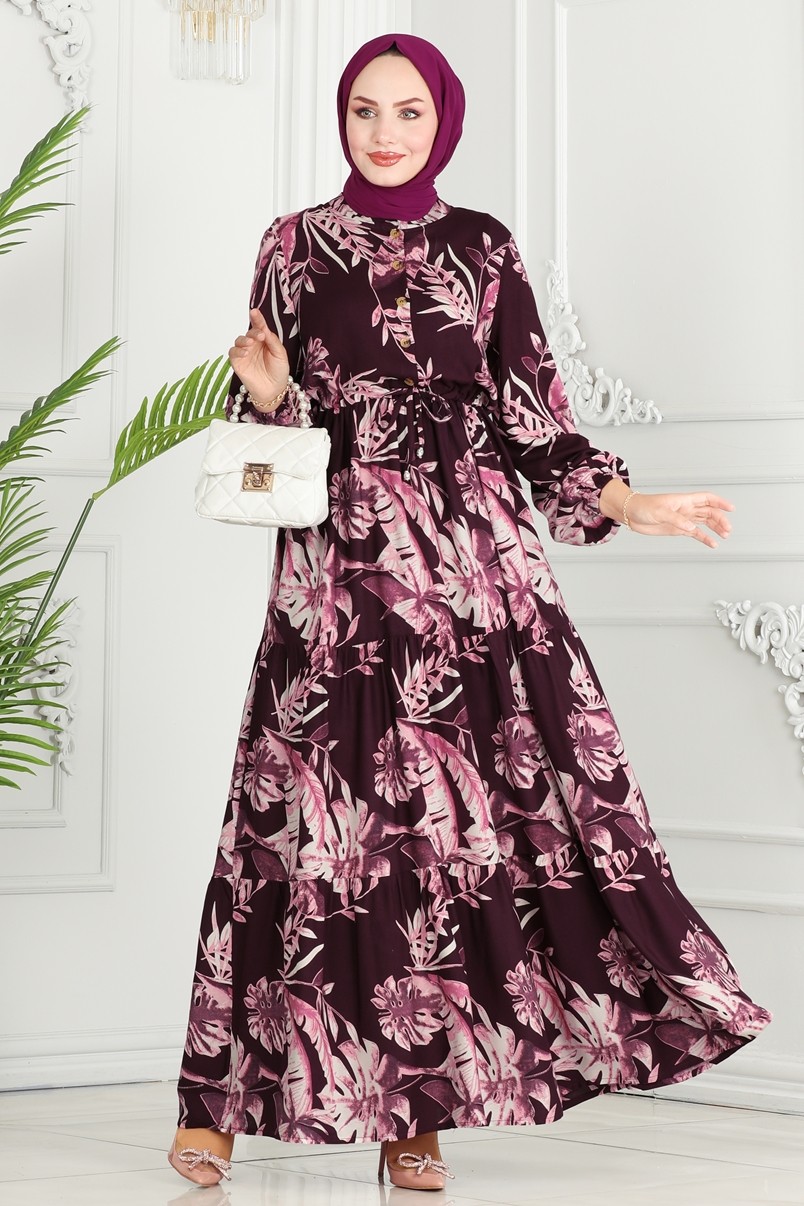 Beli Tünelli Viskon Elbise 7119BG354-MS Mürdüm