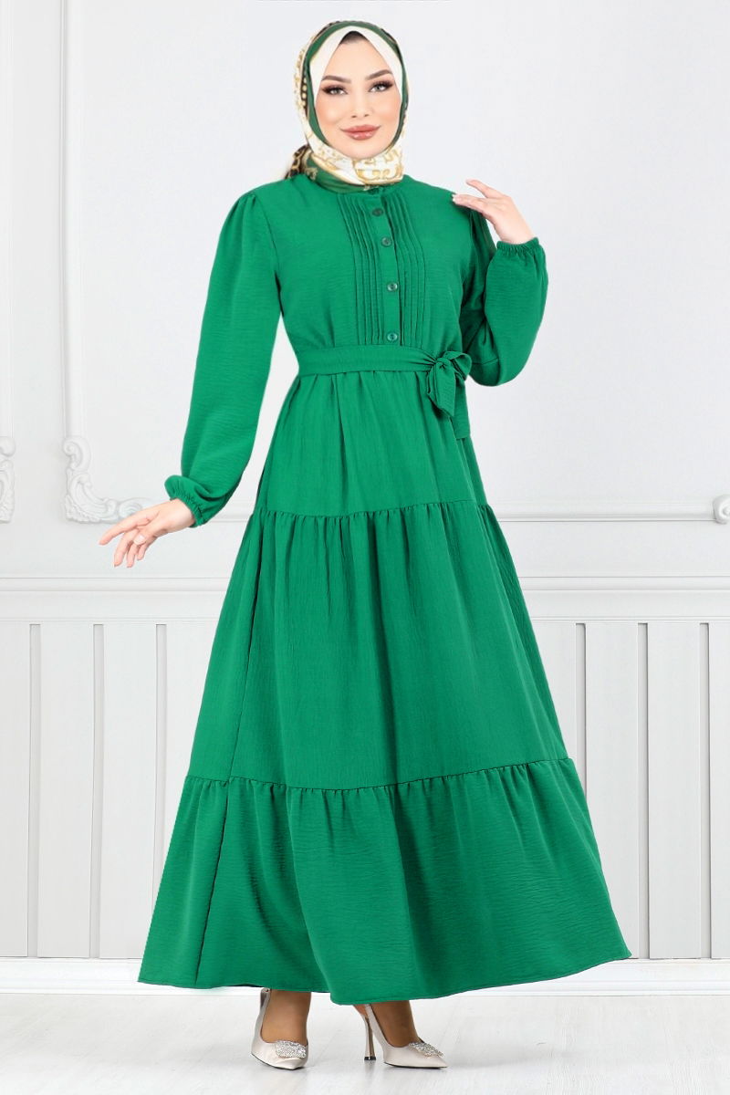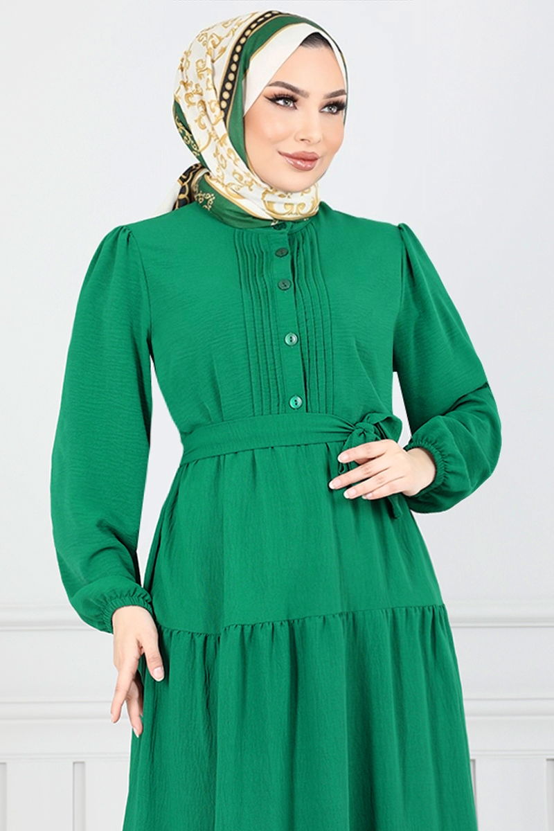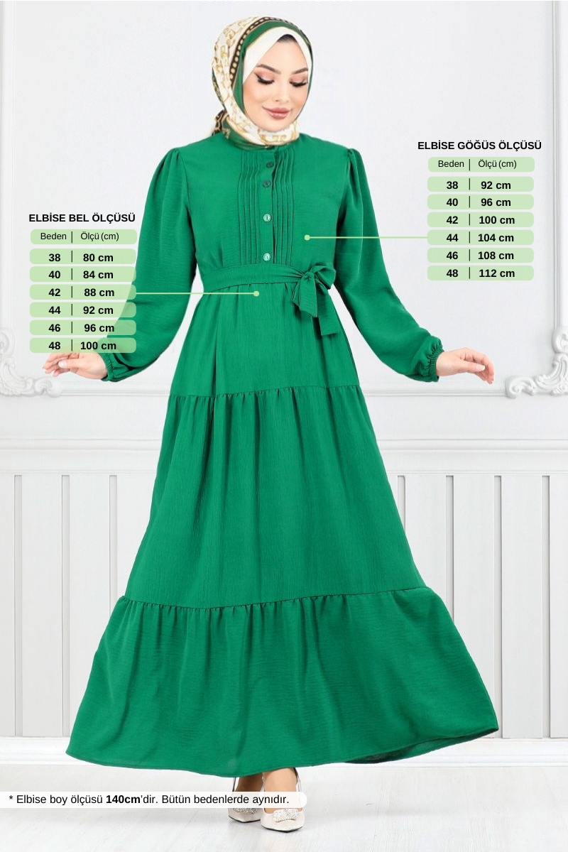 • Belted Aerobin Dress Emeralds Feature: It is made of aerobin fabric. It can be used in Four Seasonal seasons. Product Feature: New season hijab is a fashion product. The product is the dominant collar. The product has a half button that can be used from the front. It is unlined. The belt is included in the product, it may not be used on request. The cuff is rubberized.There may be a tonal difference in the product due to concept photo shoots. Washing : IT CAN BE WASHED WITHOUT TIGHTENING AT 30 DEGREES.(DELICATE WASHING) Belt Feature: The two ends of the belt are sewn so that it does not fluctuate, the middle part is left empty (seamless). (The item on the model is size 38.)