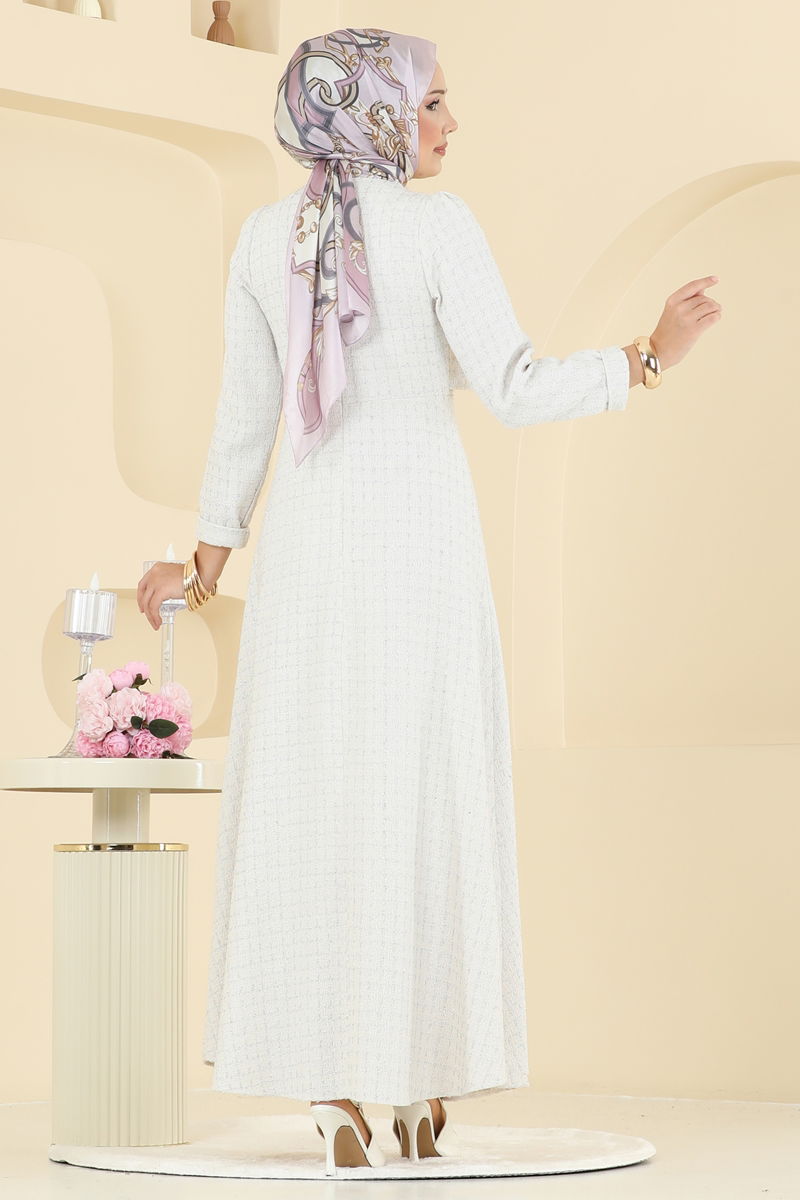 Bolero Aksesuar Detaylı Elbise, özgün tasarımı ve zarif görünümü ile soğuk mevsimleri şenlendirecek. 30 derecede hassas yıkama imkanı sunan bu tesettür elbise, Bisiklet yaka ve fermuarlı arka kısımı ile kullanışlıdır. Tüvit malzemeden yapılmış olan bu parça, astarsız olup, elbiseye eklenen bolero detayı ile kurdele aksesuarı isteğe göre ayarlanabilir. İlgili elbise için 38 beden örnek teşkil etmektedir.