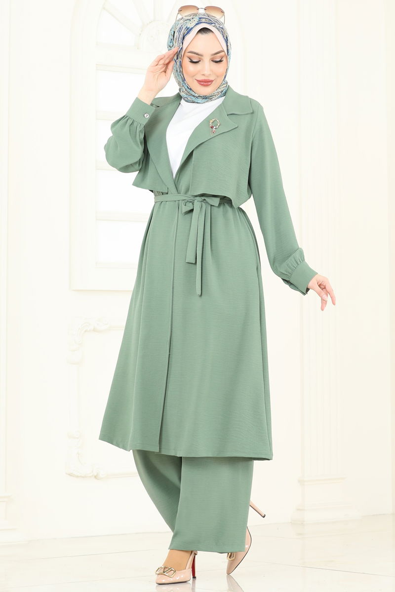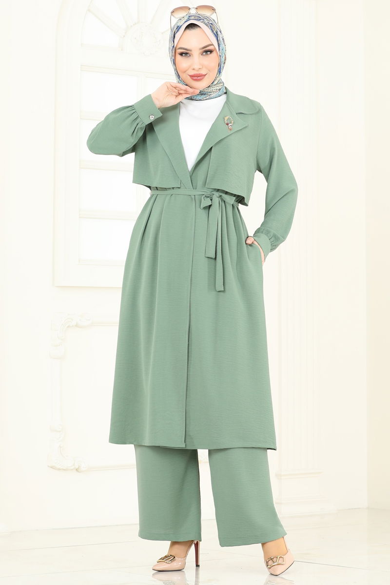 Ürün Özellikleri: Yeni sezon tesettür modası ürünü olup, ürün kruvaze yaka tasarımına sahiptir ve astarsızdır. Üründe bulunan kemer, opsiyonel kullanıma göre ayarlanabilir, kemer ürüne dahildir. Üst kısmı bluz dahil değildir; sadece kombin önerisi olarak gösterilmiştir. Ürün aksesuarları hariçtir. Pantolonun beli lastikli olup günlük kullanım rahatlığı sağlar. Manşetlerde düğmeler aktif olarak kullanılabilir. Ürün renkleri çekimlerden dolayı farklılık gösterebilir.